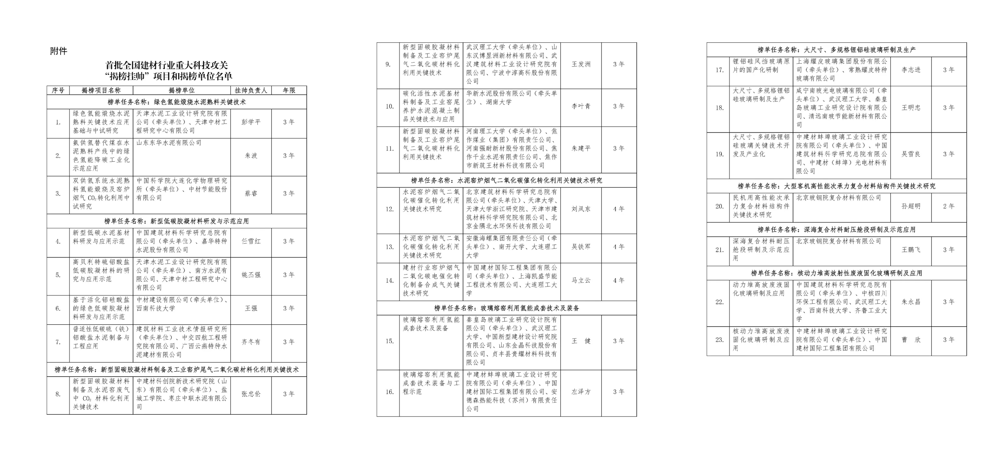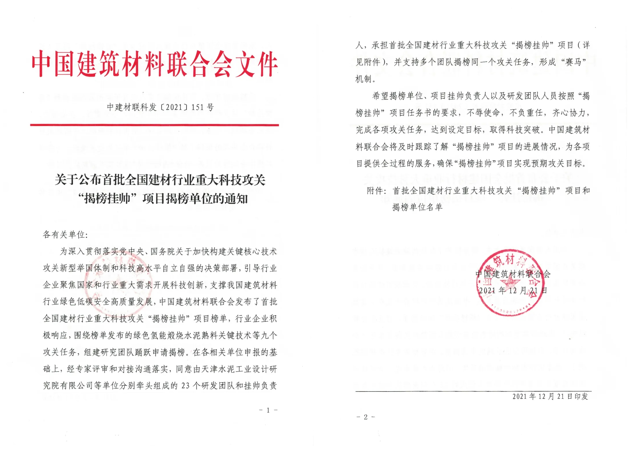 據(jù)悉,為貫徹落實(shí)黨中央、國務(wù)院決策部署,引導(dǎo)行業(yè)企業(yè)聚焦國家和行業(yè)重大需求開展科技創(chuàng)新,支撐我國建筑材料行業(yè)綠色低碳安全高質(zhì)量發(fā)展,中國建筑材料聯(lián)合會(huì)創(chuàng)新開展了全國建材行業(yè)“揭榜掛帥”科技項(xiàng)目攻關(guān)工作,發(fā)布了首批“揭榜掛帥”項(xiàng)目榜單。